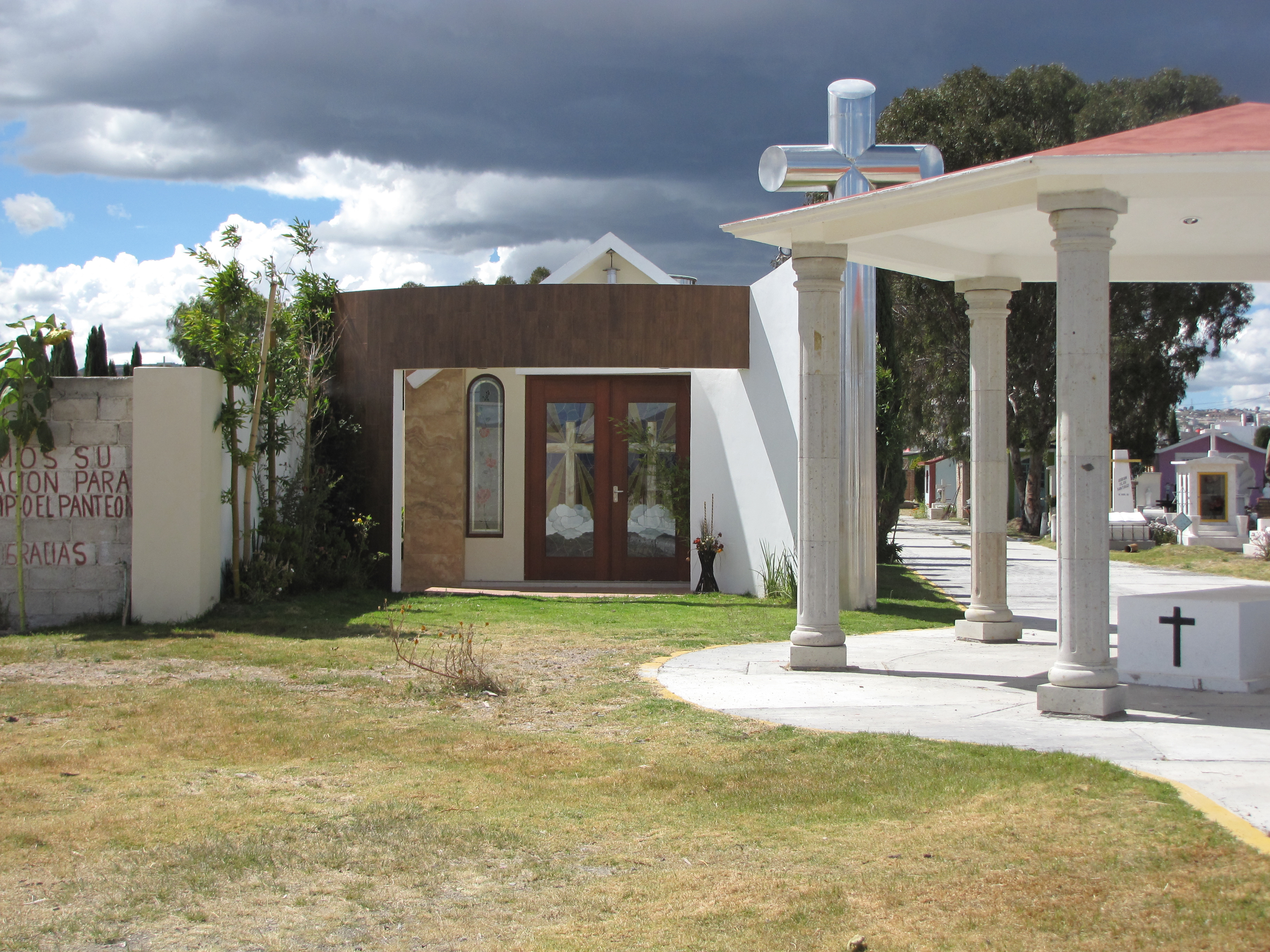 Una capilla rectangular de vidrios polarizados y cortados en vitrales con dos cruces sobre nubes celestiales en las dos puertas principales hechas en madera de pino, y unas rosas en las ventadas laterales, acabados finos en loseta, yeso y formica, de unos cuatro por ocho metros cercado por corredores de pasto perfectamente cortados y maceteros con flores diversas y pequeños árboles, en cuya fachada, a la derecha, se alza una cruz plateada de cuatro metros de altura, similar a la Iglesia de la Virgen de San Juan de Los Lagos, templo católico del lugar ubicado en la esquina de las calles Cedro y Álamo, donde en el año 2009 se edificó el Centro de catecismo Juan Pablo II, cuya placa conmemorativa reza: “Donada por Heriberto Lazcano Lazcano”.