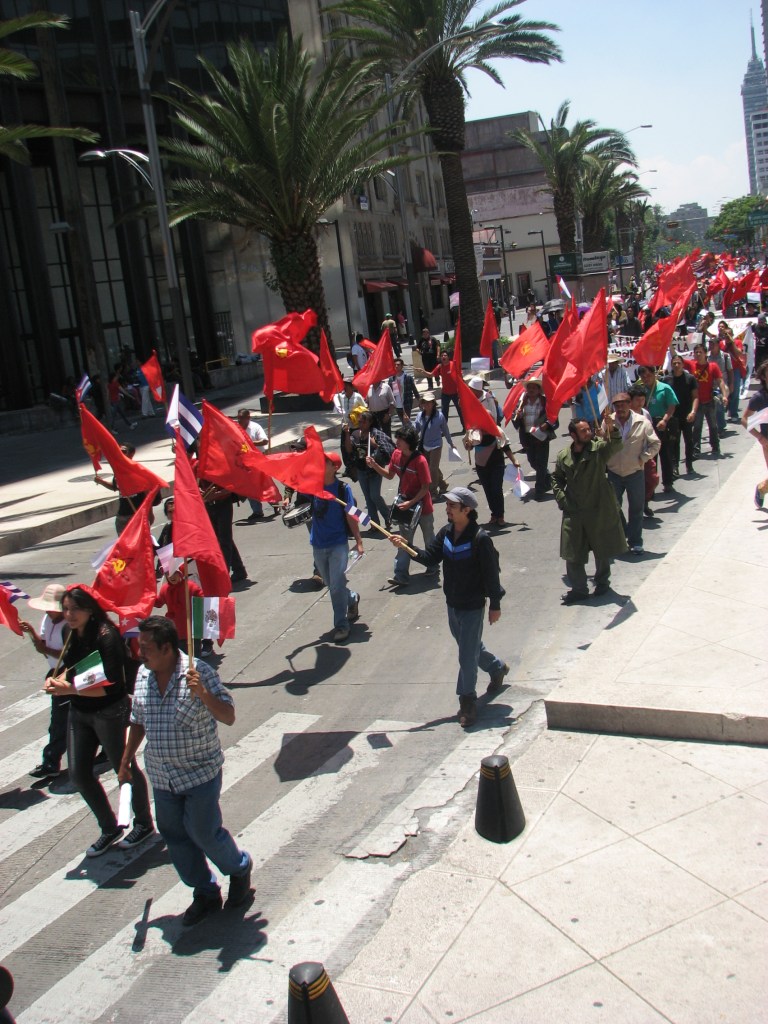 El destino fue la Embajada de Estados Unidos. Símbolo del imperialismo y la intervención genocida. Desde el Hemiciclo, sobre Avenida Juárez, cruzando la Avenida de los Insurgentes y hasta avenida Reforma, el bloque del Partido Comunista de México parecía sellar así la memoria y su inevitable destino. El mismo de los juaristas, de la insurgencia independentista y de la guerrilla anticolonialista. Paso a paso, los héroes parecían unírseles. Coro a coro. Como una fuerza invisible parecida a una ráfaga de viento que empujaba la marcha, estirando las banderas, haciendo del martillo y la hoz un motor de acero. Les alentaba hacia la historia combatiente mexicana. Hidalgo, Morelos, Zapata, Villa, Arturo Gámiz o Rubén Jaramillo, al lado del contingente rojo; y luego, Camilo, el Che, Almeida, Mella, y también Manuel Marulanda, Raúl Reyes y Alfonso Cano, habitando una bandera de las FARC-EP, que como en cada manifestación del PCM, ocupa su lugar en medio del grupo, justo en el corazón.