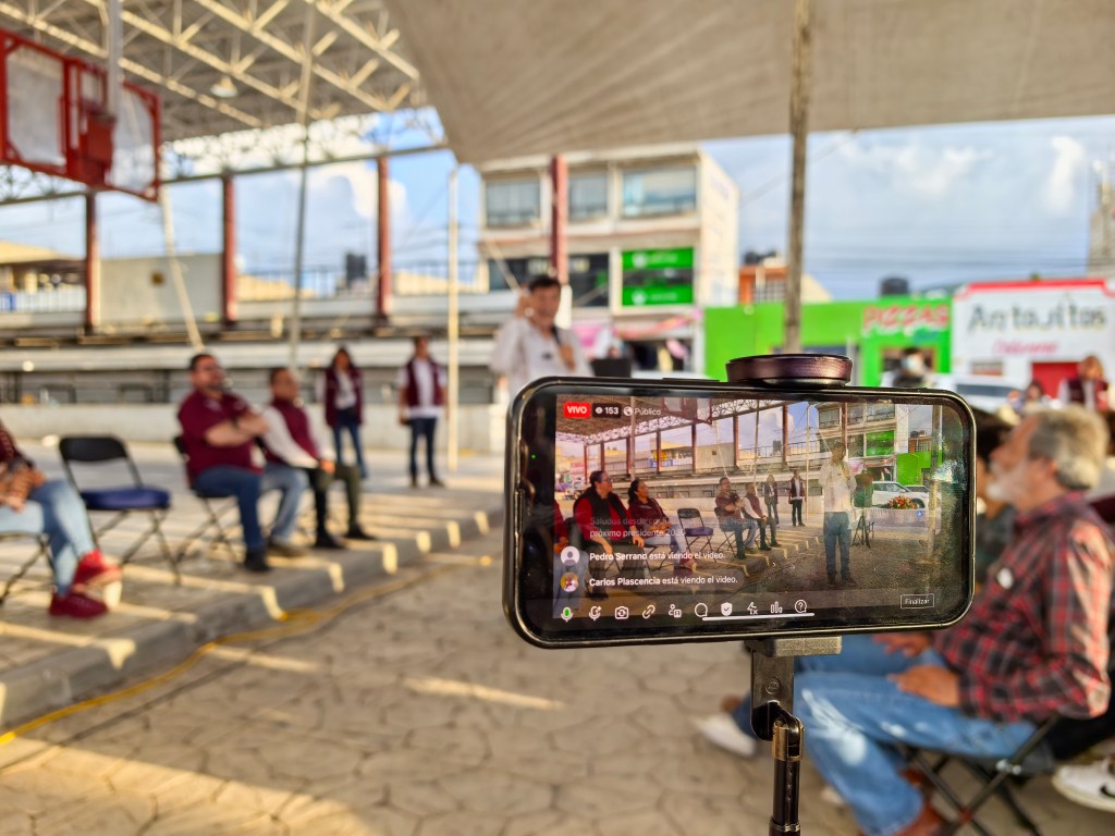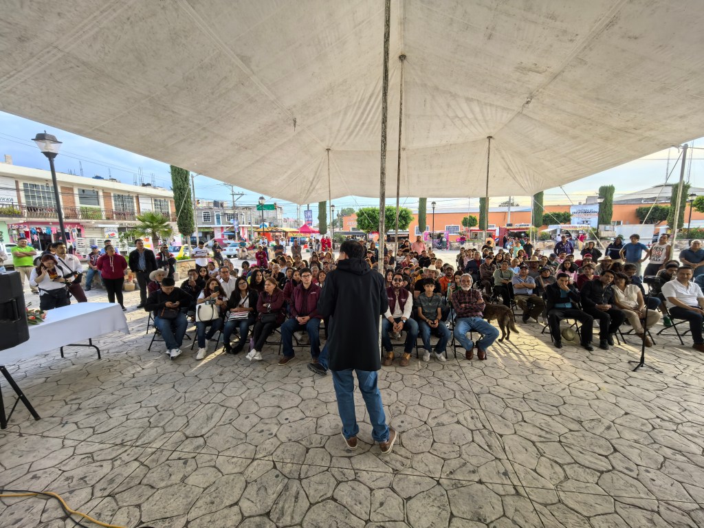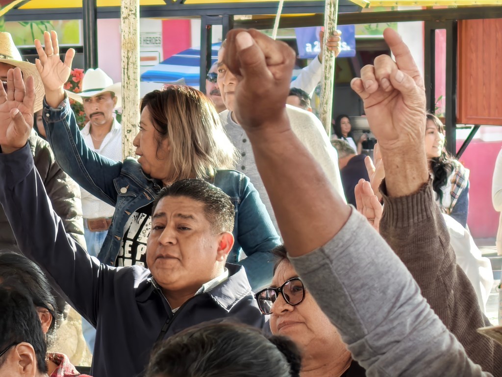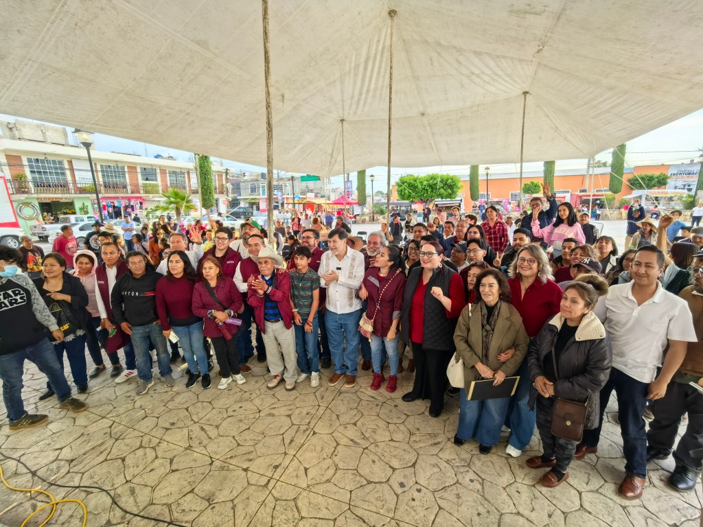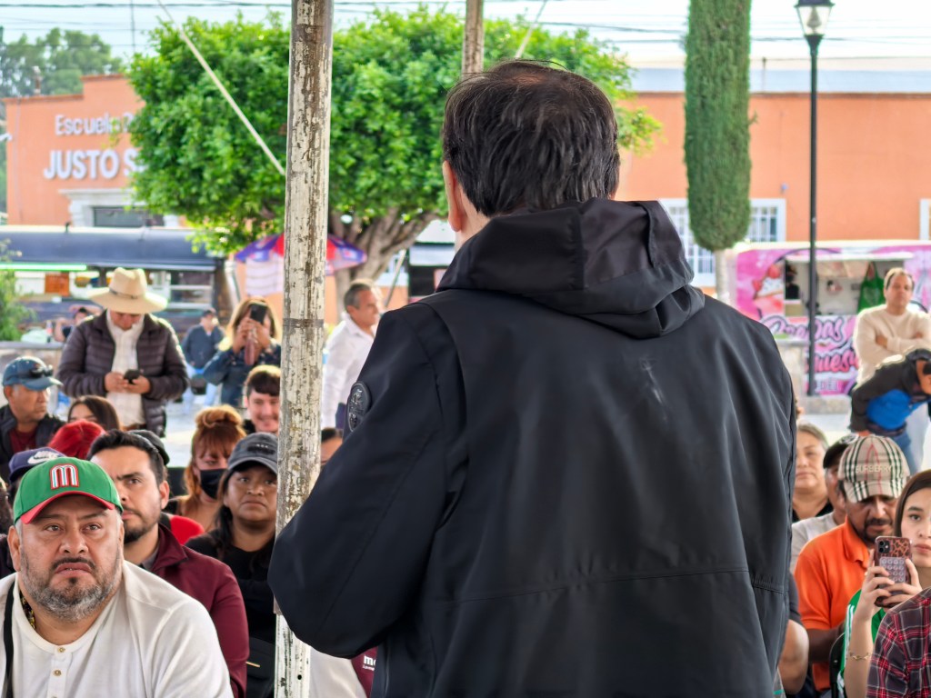 Corren despacio los últimos minutos de luz del domingo; sin embargo, hay suficiente calor para andar sin chamarra. Las hermanas siguen arrastrándose, hincándose los colmillos en las piernas, gruñendo con ternura, lamiéndose las orejas y sacudiéndose de pronto el polvo que también arrastra algunas hojas secas sobre su pelaje amarillo. La gente parece acostumbrada a sus juegos. Nadie les reprende, ni les tira una patada, aun si, entre sus juegos, caen a los pies de algún viejo que prefiere alzar los suyos, antes de pisarles la cola. Bajo la techumbre, el balón sigue rodando. Y el maestro de ceremonias no evita distraerse con una que otra jugadita; hasta que, por una esquina de la plaza, cerca de donde se halla la Presidencia Municipal, llega el senador Noroña escoltado de la senadora por Hidalgo, Simey Olvera, la diputada local, Tania Meza y el presidente de Morena en el estado, Marco Rico.